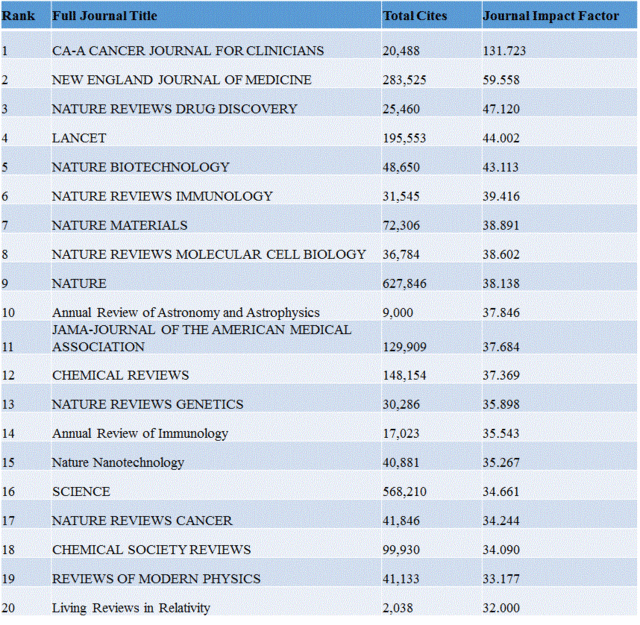 2016年6月14日訊-- 北京時(shí)間6月14日,湯森路透《SCI期刊分析報告》(Journal Citation Reports)新鮮出爐。第一第二依然是CA-Cancer J Clin和NEJM,NATURE REVIEWS DRUG DISCOVERY此次排名上升為第三。第4-7位分別為L(cháng)ancet,NATURE BIOTECHNOLOGY,NATURE REVIEWS IMMUNOLOGY,NATURE MATERIALS。